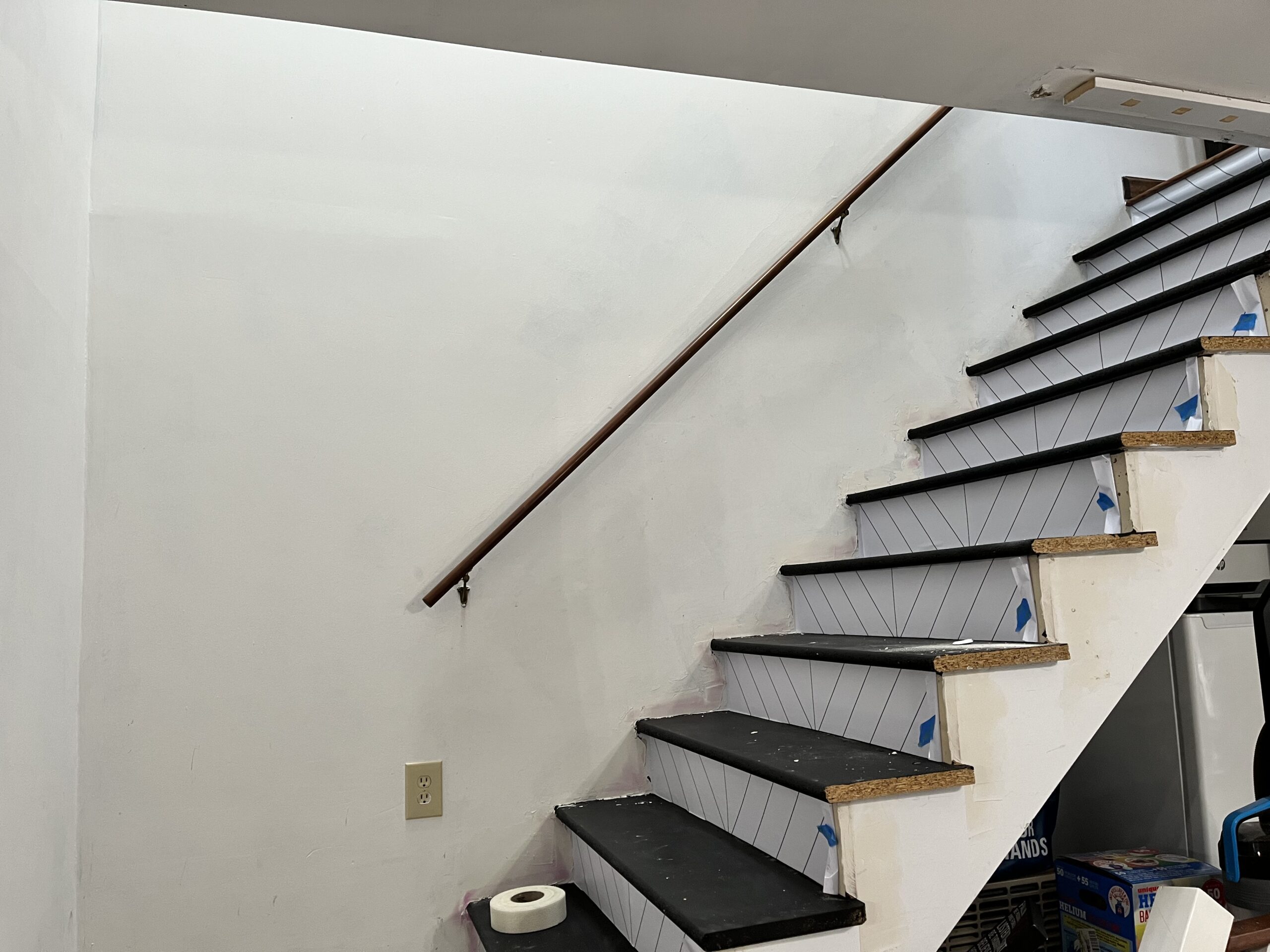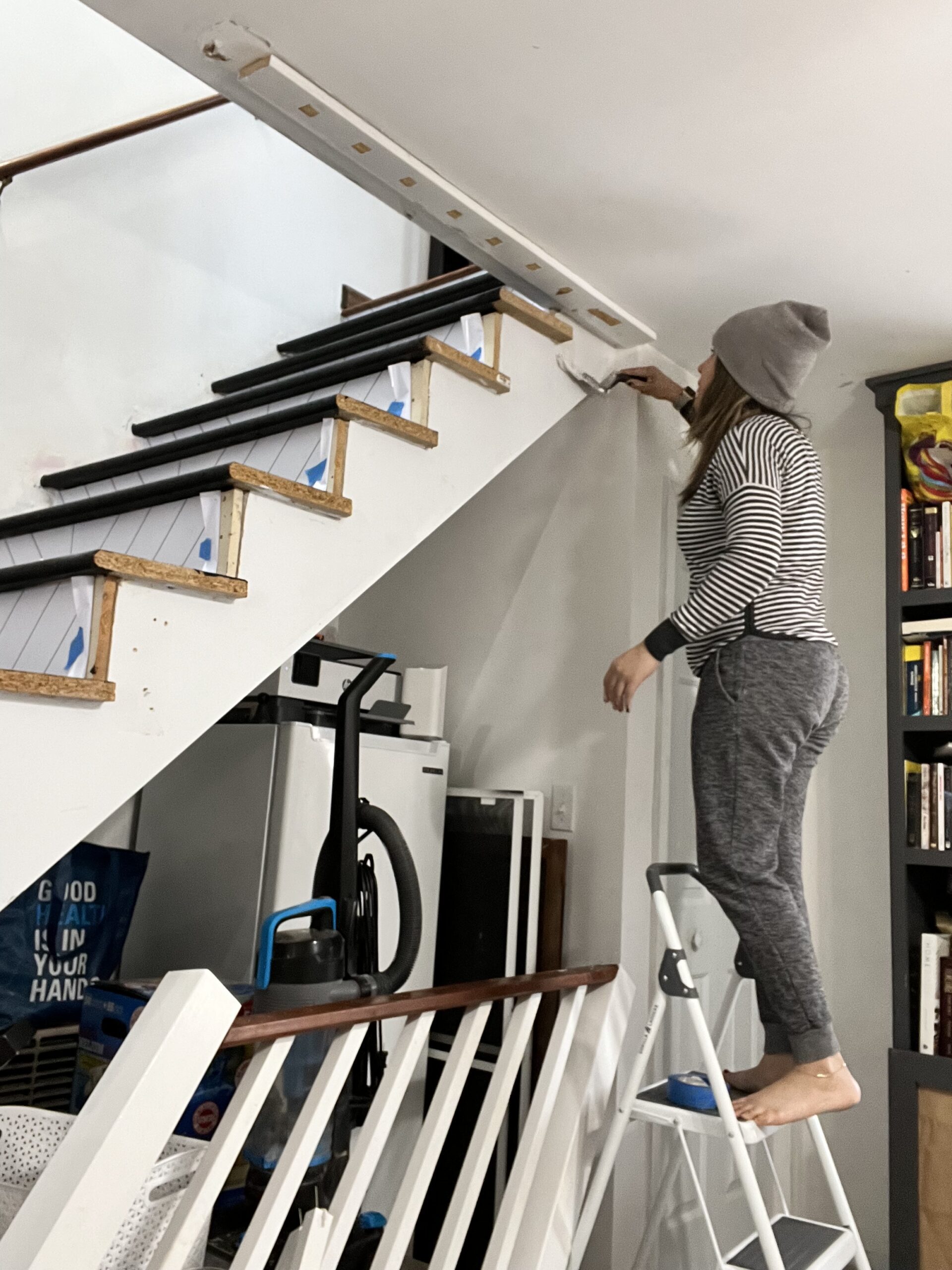 Luego de remover todo, limpié y rellené todos los espacios que había entre la escalera y la pared. Usé backer rods que se consiguen en ferreterías, Home Depot o Amazon para aplicar caulking.